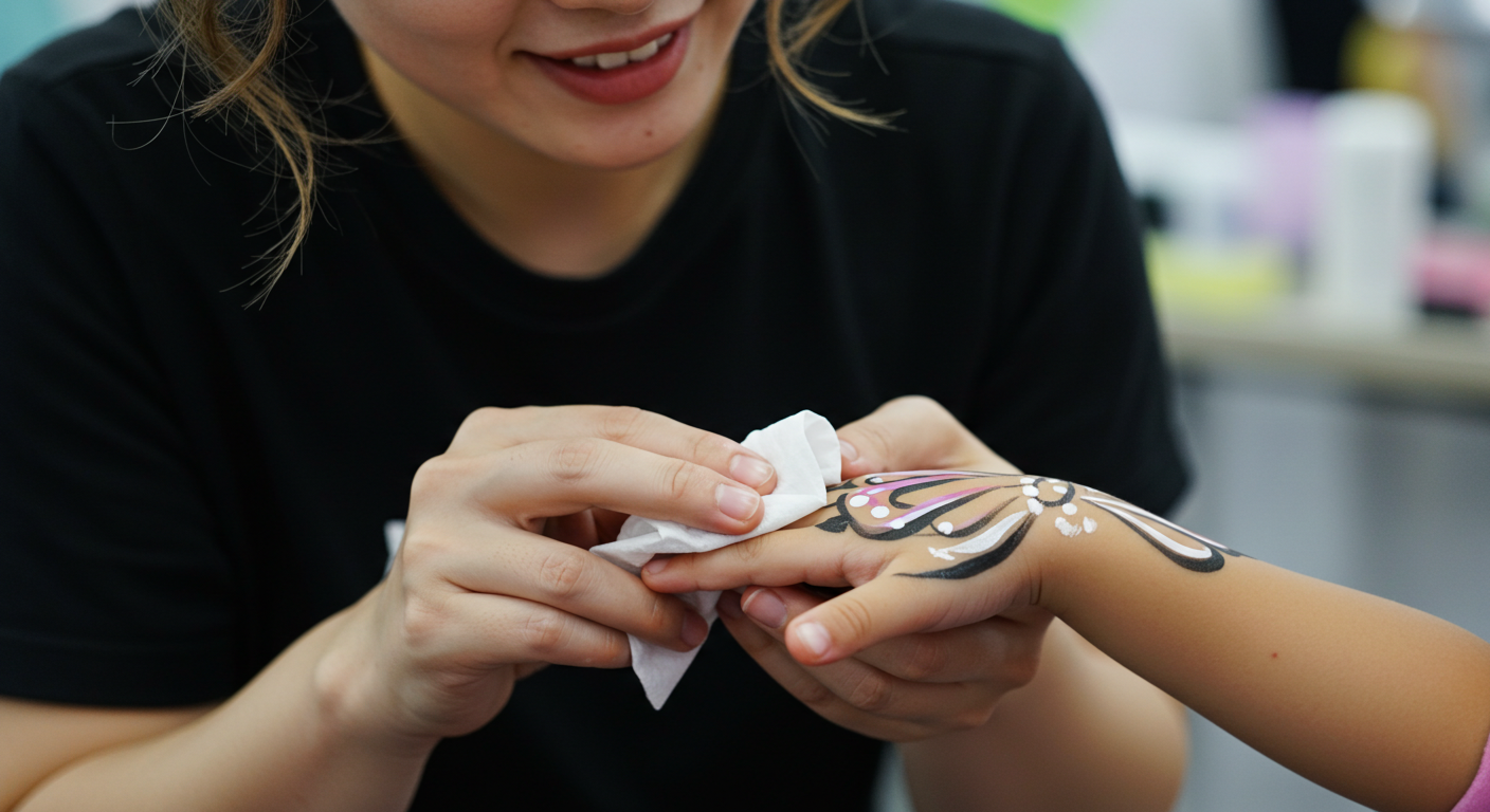 페이스페인팅을 진행할 때 땀이 많은 고객을 만나게 되면, 먼저 얼굴의 땀과 유분기를 깨끗하게 제거하는 것이 중요합니다. 그렇지 않으면 페인트가 피부에 제대로 밀착되지 않거나, 땀 때문에 그림이 번질 수 있습니다. 이럴 때 물티슈는 가장 간편하면서도 효과적인 도구입니다.