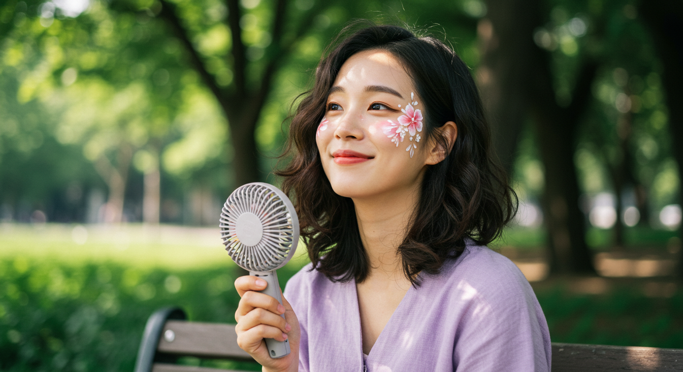 가장 중요한 준비물 중 하나가 바로 손풍기입니다. 여름철 야외 부스는 텐트가 있다 해도 내부 온도가 금세 올라갑니다. 특히 페이스페인팅 부스는 고객과 가까운 거리에서 작업을 하기 때문에, 더운 공기 속에서 땀이 쉽게 나게 됩니다.